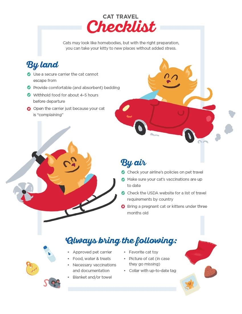 You will need to invest in a carrier that is strong and easy to clean should the cat urinate, defecate or become sick during the journey. Also consider the weather you will be traveling in - both your present situation and the likely temperature of your destination. If it is likely to be very hot then use a carrier which allows good air flow - if it is going to be cold then one which can provide draft-free warmth while still allowing a good air flow would be useful. Place the carrier where it will be secure if you have to brake suddenly but where it has a good air flow - i.e. not underneath lots of other luggage in the back of the car. Do not put the cat in the trunk and take care with the rear of hatchbacks - ventilation may be poor and the cat may overheat. You can secure the carrier behind one of the front seats or use the seat belt to make sure it is held securely on the seat.